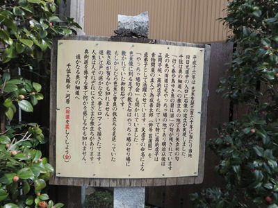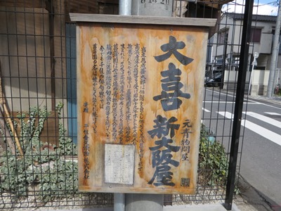 ここから墨堤通りと交差する千住仲町交差点まで、板張りの旧千住宿の紹介板があちこちで飾られていた。 |